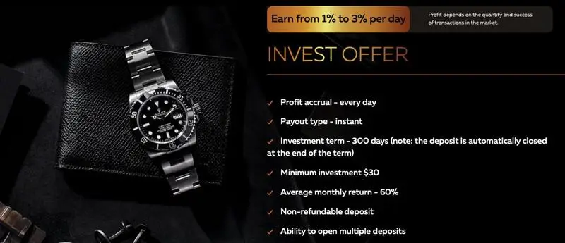 Luxwatches (luxwatches.club) is a high-yield investment program (HYIP) that offers an opportunity to earn lucrative returns on your investment. With a minimum deposit of just $30, you can start participating in this platform.