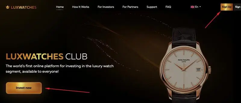To cooperate with the Luxwatches Club platform you need to create an account, for this purpose go to the main page of the fund and use the «Sign Up» button or click «Invest now».