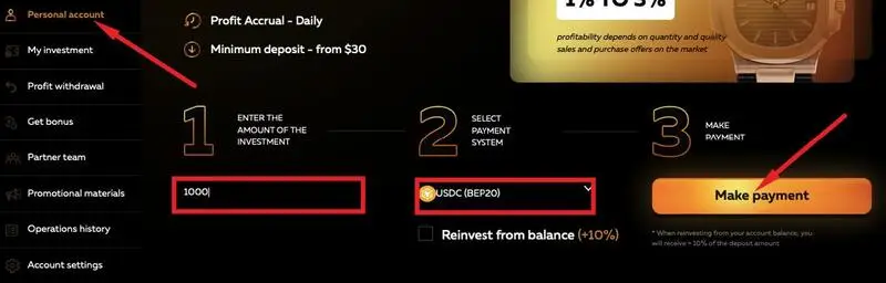 The investment is made through the «Personal account» section. Scroll down the page to the form of creating a deposit, where you should enter the amount, payment system and press the «Make p?yment» button. Then everything is standard - you will be given a wallet to which you need to transfer money.